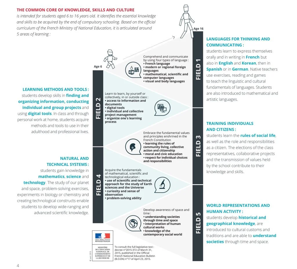 French education is based on 3-year cycles from Petite Section (PS) to 3ème (grade 9) with a common core of skills to be acquired from CP (grade 1) to 3ème.