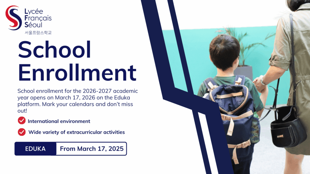 Enrollments for the 2026-2027 academic year at Lycée Français de Séoul (LFS) will open on Tuesday, March 17. Kindly find below all the information your need to prepare for your child’s admission for the 2026-2027 school year