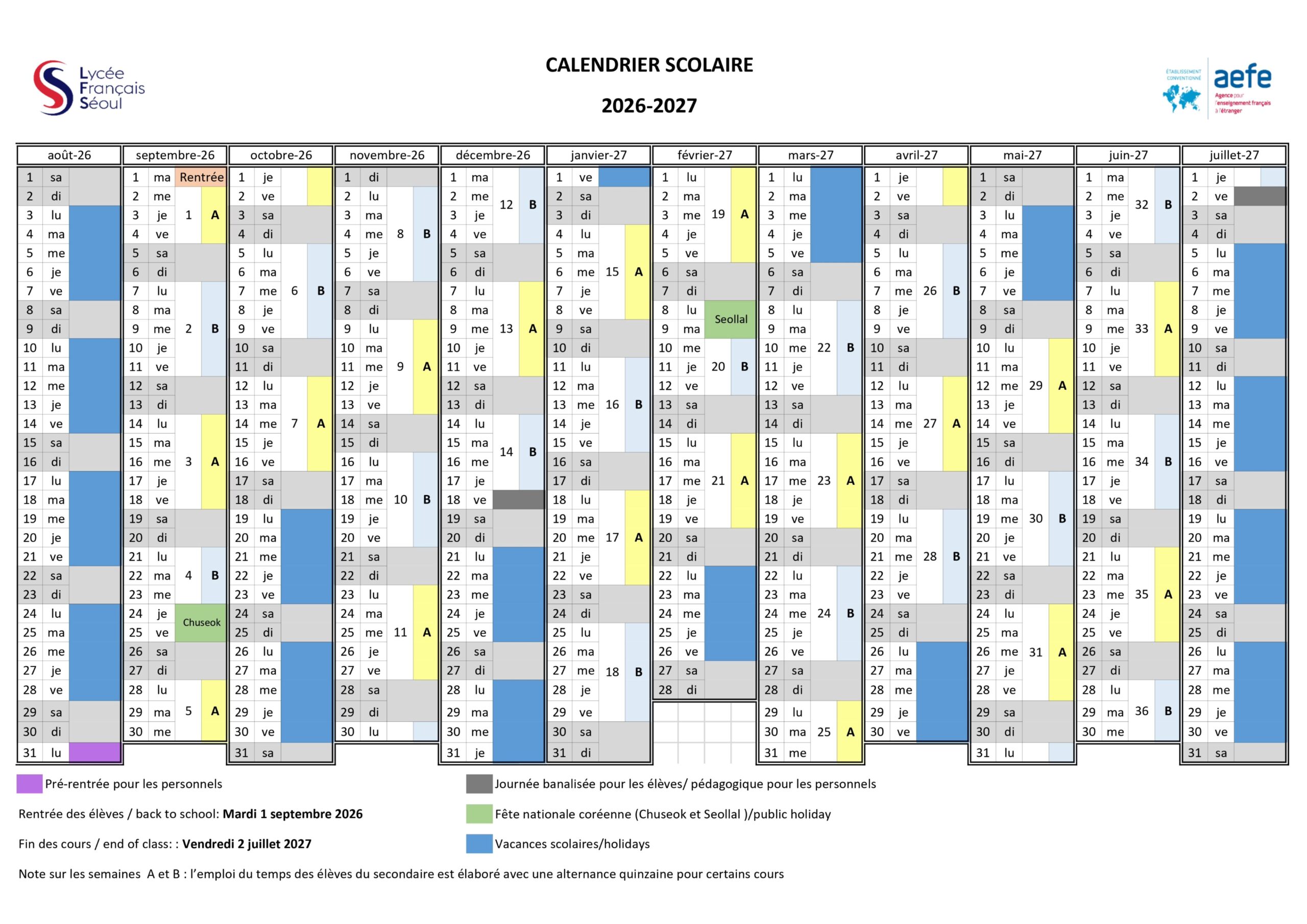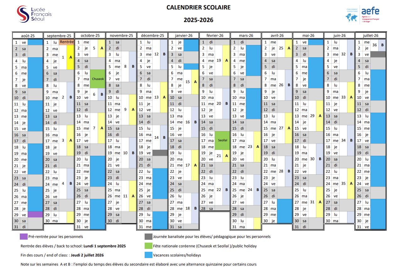 L’année scolaire du Lycée Français de Séoul (LFS) commence début septembre et se termine début juillet.