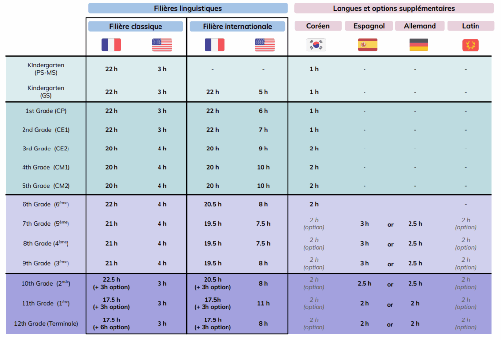 Dès l’âge de 3 ans, tous les élèves sont exposés à 3 langues : le français, l’anglais et le coréen. Au fur et à mesure de leur scolarité, ils consolident la maîtrise du français et de l’anglais, apprennent une troisième puis une quatrième langue : le coréen, l’allemand ou l’espagnol.